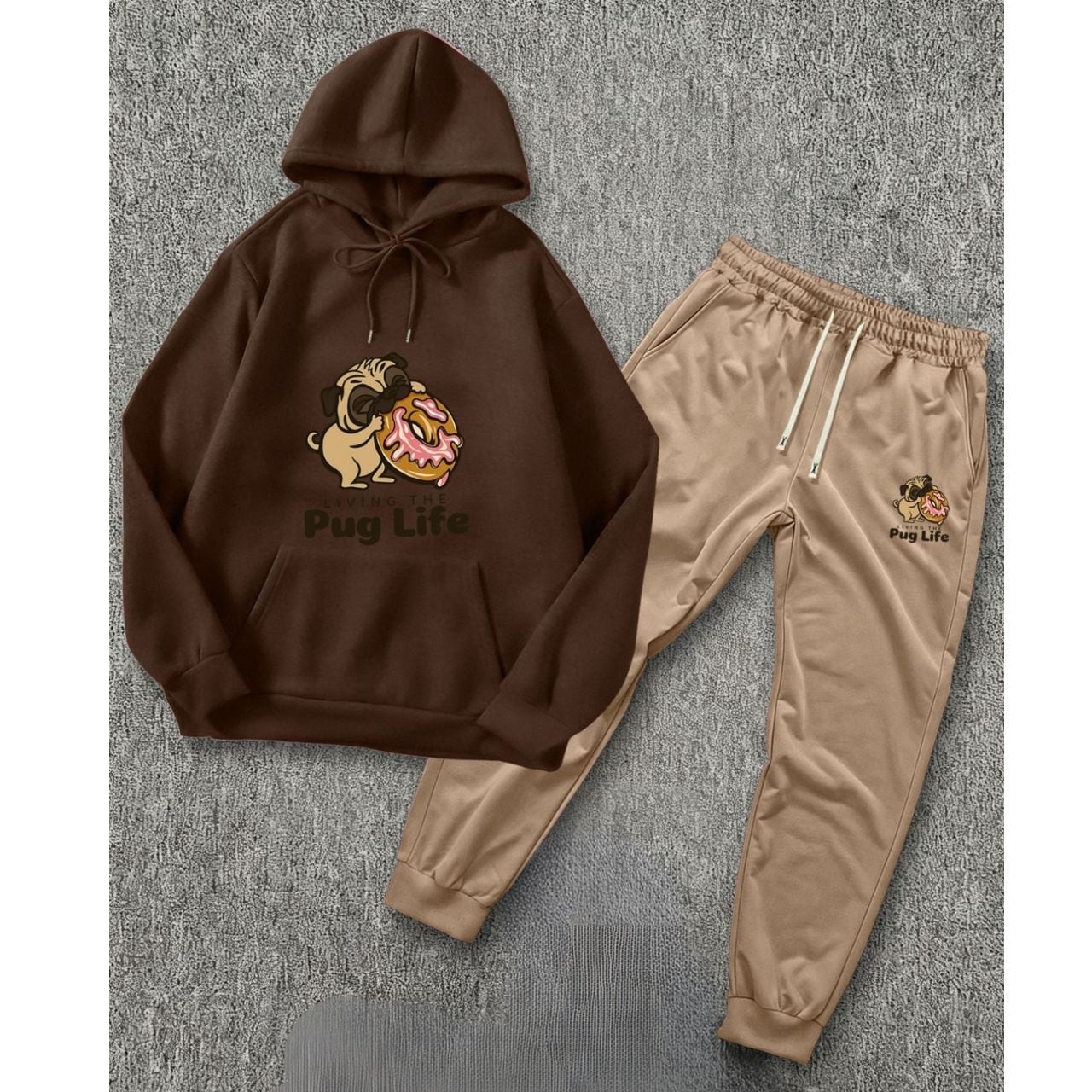 ドーナツを頬張るパグさんのイラストがユニークな、パーカーとパンツのセットアップです。