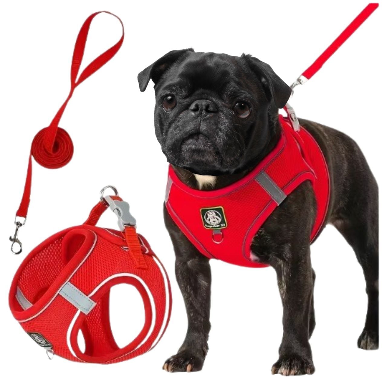 前足を通して背中側でカチッと留めます。簡単装着のハーネスとリードのセットです。