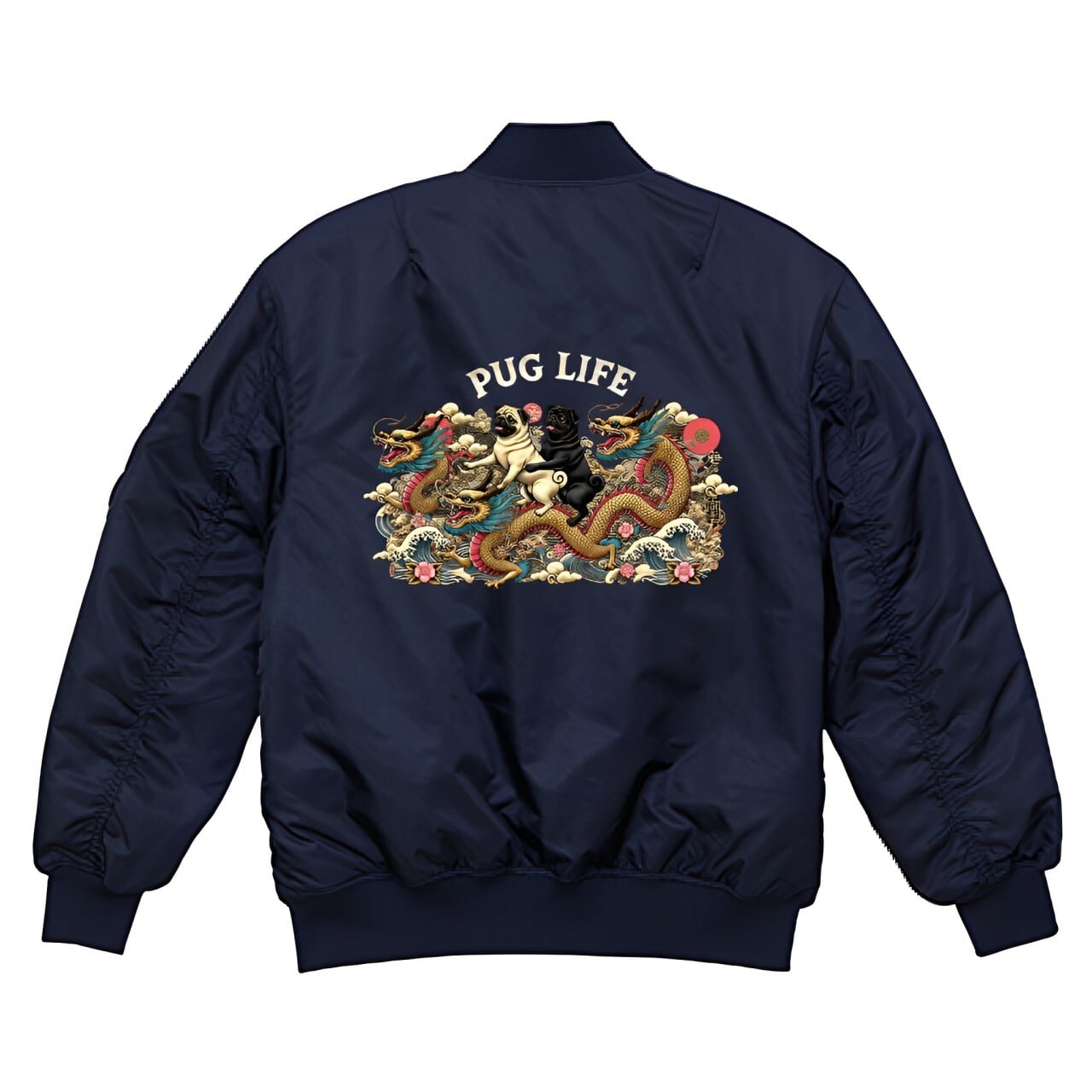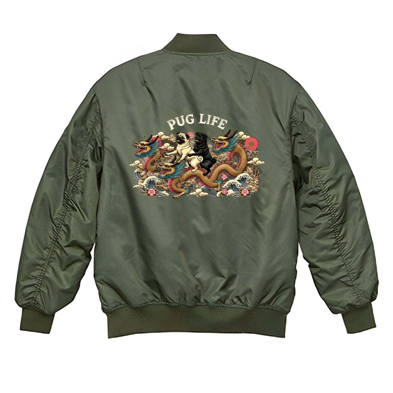 【商品詳細】 フォーンさんと黒パグさんが竜に乗って空を飛ぶ! 中綿入りで暖かい、MA-1 ジャケットです。 はっ水や防風、中綿入りで保温性もばっちりな機能性抜群の1着です。 寒い日のお散歩はもちろん、パグミーティングにもドヤ顔で着ていこう! 【素材】 ナイロン 100% ツイル 〈裏地〉ポリエステル 100% 〈保温材〉ポリエステル 100% 〈リブ〉ポリエステル 97%、ポリウレタン 3% 【サイズ】 S 胸囲:110cm 肩幅:49cm 袖丈: 63cm 着丈:65cm M 胸囲:116cm 肩幅:51cm 袖丈: 64cm 着丈:68cm L 胸囲:122cm 肩幅:55cm 袖丈: 65cm 着丈:71cm XL 胸囲:128cm 肩幅:59cm 袖丈: 66cm 着丈:74cm 【お届けについて】 こちらの商品は受注生産品の為、 ご入金から3~4週間前後でお届け致します。 ◼️注意事項 ・タイミングによっては 商品在庫切れにより 注文キャンセルとさせていただく恐れもございますので、予めご了承くださいませ。 ・仕入れ工場を変えることがあるため、記載サイズと若干異なる場合がございます。 ・商品の色味は、お手持ちのスマートフォンの画面によって実物と若干異なる場合がございます。 ・イメージ違いやサイズ交換等、お客さまご都合による交換、返品は対応出来かねます。 ———————————— ご購入前にこちらをお読みください →https://mochitto7.base.shop/about ————————————